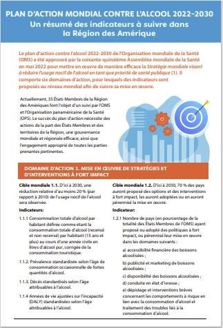 Le plan d’action contre l’alcool 2022-2030 de l'Organisation mondiale de la Santé (OMS) a été approuvé par la soixante-quinzième Assemblée mondiale de la Santé en mai 2022 pour mettre en œuvre de manière efficace la Stratégie mondiale visant à réduire l'usage nocif de l'alcool en tant que priorité de santé publique. Cette fiche d’information présente un résumé des indicateurs proposés au niveau mondial pour le suivi de sa mise en œuvre dans les Amériques.
