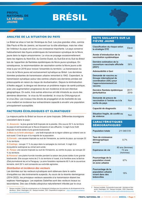La fièvre jaune est endémique dans plusieurs pays d'Amérique latine. Afin d'aider les décideurs à hiérarchiser les actions de prévention contre cette maladie, l'Organisation panaméricaine de la santé présente ces profils de pays avec une sélection concise et complète de données provenant des pays endémiques. Chaque profil fournit une analyse de la situation actuelle du pays, des facteurs écologiques et climatiques associés à la maladie, de la distribution et de l'incidence des vecteurs, ainsi que des principales activités des arbovirus. Il comprend également une perspective historique de l'épidémiologie et un résumé de la situation de la vaccination contre la maladie dans le pays.