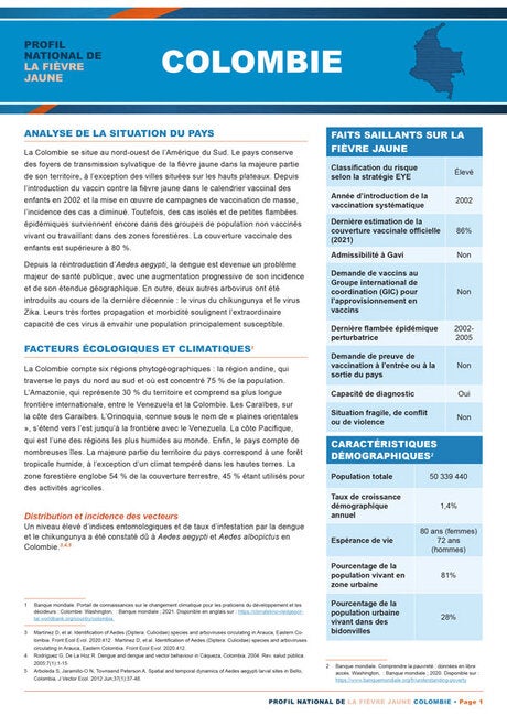 La fièvre jaune est endémique dans plusieurs pays d'Amérique latine. Afin d'aider les décideurs à hiérarchiser les actions de prévention contre cette maladie, l'Organisation panaméricaine de la santé présente ces profils de pays avec une sélection concise et complète de données provenant des pays endémiques. Chaque profil fournit une analyse de la situation actuelle du pays, des facteurs écologiques et climatiques associés à la maladie, de la distribution et de l'incidence des vecteurs, ainsi que des principales activités des arbovirus. Il comprend également une perspective historique de l'épidémiologie et un résumé de la situation de la vaccination contre la maladie dans le pays.