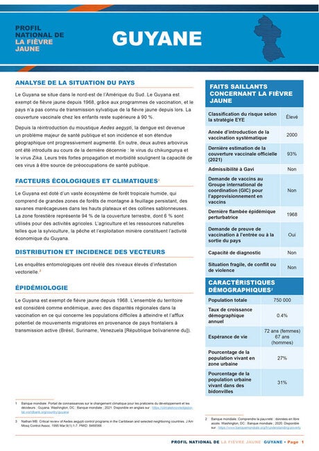 La fièvre jaune est endémique dans plusieurs pays d'Amérique latine. Afin d'aider les décideurs à hiérarchiser les actions de prévention contre cette maladie, l'Organisation panaméricaine de la santé présente ces profils de pays avec une sélection concise et complète de données provenant des pays endémiques. Chaque profil fournit une analyse de la situation actuelle du pays, des facteurs écologiques et climatiques associés à la maladie, de la distribution et de l'incidence des vecteurs, ainsi que des principales activités des arbovirus. Il comprend également une perspective historique de l'épidémiologie et un résumé de la situation de la vaccination contre la maladie dans le pays.