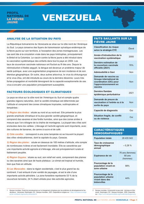 La fièvre jaune est endémique dans plusieurs pays d'Amérique latine. Afin d'aider les décideurs à hiérarchiser les actions de prévention contre cette maladie, l'Organisation panaméricaine de la santé présente ces profils de pays avec une sélection concise et complète de données provenant des pays endémiques. Chaque profil fournit une analyse de la situation actuelle du pays, des facteurs écologiques et climatiques associés à la maladie, de la distribution et de l'incidence des vecteurs, ainsi que des principales activités des arbovirus. Il comprend également une perspective historique de l'épidémiologie et un résumé de la situation de la vaccination contre la maladie dans le pays.