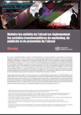 Ce bref document résume les principaux éléments du rapport de l’OMS intitulé « Réduire les méfaits de l’alcool en réglementant les activités transfrontalières de marketing, de publicité et de promotion de l’alcool ». Il décrit la façon dont le marketing de l’alcool franchit les frontières nationales, souvent par des canaux numériques et souvent sans considération pour l’environnement social, économique ou culturel des pays destinataires. Il met en évidence le recours de plus en plus marqué à des techniques de publicité et de promotion sophistiquées, notamment en établissant un lien entre les marques de produits alcoolisés et les activités sportives et culturelles, par des parrainages et par l’emploi de courriels, de SMS et des réseaux sociaux, l’objectif étant de fidéliser les clients et d’en attirer de nouveaux. Ce résumé explique également que les jeunes et les gros buveurs sont de plus en plus visés par la publicité pour les produits alcoolisés, souvent au détriment de leur santé, et il met en avant le besoin de réglementations nationales plus efficaces et d’une meilleure collaboration internationale.