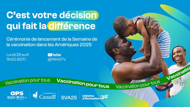 Du 26 avril au 3 mai 2025, l'Organisation Panaméricaine de la Santé (OPS), en collaboration avec les pays et territoires de la Région des Amériques et ses partenaires, célébrera la 23e Semaine de la vaccination dans les Amériques (SVA) et la 14e Journée Mondiale de la Vaccination avec l'appel à l'action : C’est votre décision qui fait la différence. Vaccination pour tous.
