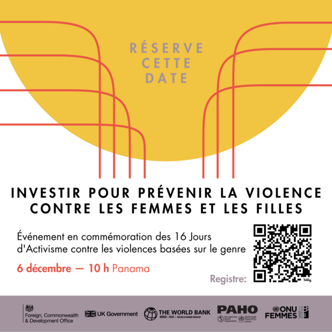 Rejoignez-nous le mercredi 6 décembre 2023, à 10h00. (heure de Panama) ou 10h00 (Washington DC, ou EST) au webinaire sur Investir pour prévenir la violence à l'égard des femmes et des filles, un événement pour commémorer les 16 jours d'activisme contre la violence de genre. Cet événement vise à créer une dynamique pour augmenter les investissements aux niveaux local, national et régional et éclairer les efforts supplémentaires pour prévenir et répondre à la violence sexiste. Il soulignera l’importance de financer différentes stratégies de prévention fondées sur des données probantes, telles que celles alignées sur le cadre RESPECT.