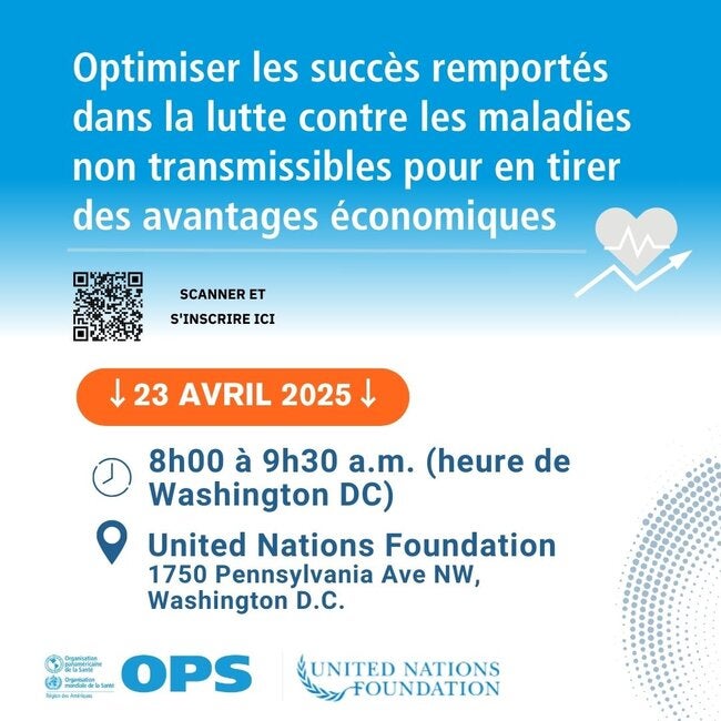 L'Organisation Panaméricaine de la Santé/Organisation Mondiale de la Santé (OPS/OMS) et la Fondation des Nations unies organisent l'événement. "Optimiser les succès remportés dans la lutte contre les maladies non transmissibles pour en tirer des avantages économiques", le mercredi 23 avril 2025, de 8h00 à 9h30 (heure de Washington DC ou EDT). L'événement réuniront les ministres des Finances, du Développement et de la Santé, ainsi que d'autres acteurs clés, afin de discuter de cet ordre du jour crucial et opportun, Dans la perspective de la quatrième Conférence internationale sur le financement du développement, du Forum politique de haut niveau pour le développement durable et de la quatrième réunion de haut niveau des Nations Unies sur la prévention et la maîtrise des maladies non transmissibles et la promotion de la santé mentale.