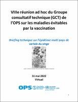Le virus de la variole du singe est un orthopoxvirus qui provoque une maladie dont les symptômes sont similaires, mais moins graves, à ceux de la variole. Alors que la variole a été éradiquée en 1980, la variole du singe continue d'être présent dans les pays d'Afrique centrale et occidentale. Deux clades distincts sont identifiés : le clade ouest-africain et le clade du bassin du Congo. La variole du singe est une zoonose. Les cas sont souvent observés en proximité des forêts tropicales humides où divers animaux sont porteurs du virus, notamment les écureuils, les rongeurs, les loirs et les singes. La plupart des infections humaines par le virus de la variole du singe dans les pays endémiques résultent d'une transmission primaire de l'animal à l'homme. La transmission interhumaine existe, la plus longue chaîne de transmission documentée étant de six générations. La transmission se fait par contact avec les fluides corporels, les lésions sur la peau ou sur les surfaces muqueuses internes, comme dans la bouche ou la gorge, les gouttelettes respiratoires et les objets contaminés. Il faut éviter tout contact étroit avec des personnes infectées ou des matériaux contaminés. Bien que la transmission d'homme à animal soit rare, elle doit être considérée comme un lien possible dans la chaîne de transmission. La variole du singe est endémique en Afrique centrale et occidentale depuis sa première détection en 1958 en la République Démocratique du Congo. Néanmoins, depuis le 13 mai 2022, cependant, plusieurs pays d'Europe ont signalé l'apparition soudaine et inattendue de la variole du singe. À ce jour, 27 pays non endémiques répartis dans quatre régions de l'OMS ont signalé des cas. Parmi ceux-ci, quatre sont des pays des Amériques. Plusieurs cas suspects dans ces pays et dans d'autres sont en cours d'investigation. Le Groupe consultatif technique (GCT) sur les maladies évitables par la vaccination s'est réuni le 31 mai 2022 afin de discuter des implications de la variole du singe dans la Région des Amériques. Le rapport résume les données épidémiologiques à ce jour, passe en revue les informations disponibles sur les vaccins contre la variole du singe, et fournit des recommandations aux États Membres des Amériques sur les stratégies pour minimiser la transmission virale et aborder les opérations de vaccination.
