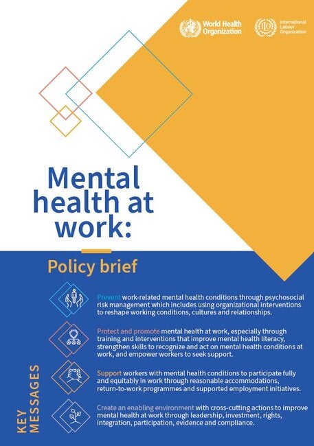 Ambientes de trabalho seguros e saudáveis podem atuar como um fator de proteção para a saúde mental. Condições de trabalho insalubres, incluindo estigma, discriminação e exposição a riscos como assédio e outras más condições de trabalho, podem representar riscos significativos, afetando a saúde mental, a qualidade de vida geral e, consequentemente, a participação ou produtividade no trabalho.