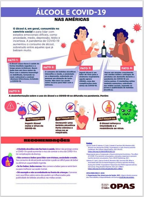 Esta ficha informativa destaca a relação entre o consumo de álcool e a COVID-19. O consumo episódico pesado é considerado um risco à saúde para a COVID-19, e o álcool é usado por alguns para lidar com as emoções difíceis que aumentaram durante a pandemia. Além de delinear por que o álcool não deve ser usado como um mecanismo para lidar com o estresse, a ficha informativa aborda a desinformação sobre o álcool em relação à COVID-19 e fornece recomendações sobre o uso de álcool durante a pandemia.