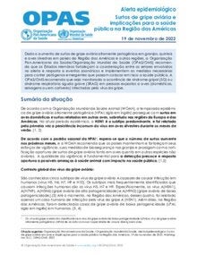 Dado o aumento de surtos de gripe aviária altamente patogênica em granjas, quintais e aves silvestres em países da Região das Américas e outras regiões, a Organização Pan-Americana da Saúde/Organização Mundial da Saúde (OPAS/OMS) recomenda que os Estados Membros fortaleçam a coordenação entre os setores envolvidos no alerta e resposta a eventos zoonóticos e implementem as medidas necessárias para conter patógenos emergentes que possam colocar em risco a saúde pública. A OPAS/OMS recomenda que seja monitorada a ocorrência de síndrome gripal (SG) ou |