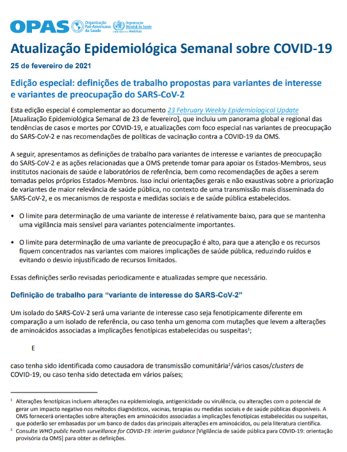 Edição especial: Definições de trabalho propostas para variantes de interesse e variantes preocupantes do SARS-CoV-2.Esta edição especial é complementar ao documento 23 February Weekly Epidemiological Update [Atualização Epidemiológica Semanal de 23 de fevereiro], que incluiu um panorama global e regional das tendências de casos e mortes por COVID-19, e atualizações com foco especial nas variantes preocupantes do SARS-CoV-2 e nas recomendações de políticas de vacinação contra a COVID-19 da OMS. A seguir, apresentamos as definições de trabalho para variantes de interesse e variantes preocupantes do SARS-CoV-2, e as ações relacionadas que a OMS pretende tomar para apoiar os Estados Membros, seus institutos nacionais de saúde e laboratórios de referência, bem como recomendações de ações a serem tomadas pelos próprios Estados Membros. Isso inclui orientações gerais e não exaustivas sobre a priorização de variantes de maior relevância de saúde pública, no contexto de uma transmissão mais disseminada do SARS-CoV-2, e os mecanismos de resposta e medidas sociais e de saúde pública estabelecidos.