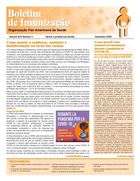 Nesta Edição: Como manter a confiança: combater a desinformação em torno das vacinas | O que aprendi como assessora de imunização durante a pandemia de COVID-19... Dra. Karen Broome | Perguntas frequentes sobre a vacinação contra COVID-19 | Validação de ferramenta de categorização do risco para o monitoramento da rede de frio na instância local | Aspirar ou não aspirar antes de administrar uma vacina? | Preços de vacinas compradas por meio do Fundo Rotativo da OPAS, 2020 | Preços de seringas compradas por meio do Fundo Rotativo da OPAS, 2020-2021