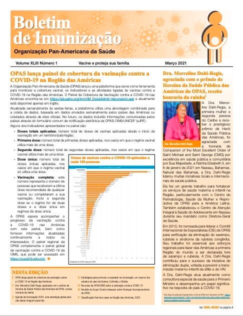 Nesta edição: OPAS lança painel de cobertura da vacinação contra a COVID-19 na Região das Américas | Dra. Merceline Dahl-Regis, agraciada com o prêmio de Heroína da Saúde Pública das Américas da OPAS, recebe honraria da rainha | Agenda da Imunização 2030: uma estratégia global para não deixar ninguém para trás3 Estratégias para promover a equidade na imunização: um resumo dos estudos de caso da Guiana, Colômbia, e Bolívia | Recursos da OPAS/OMS sobre a vacinação contra a COVID-19 | Reunião do Grupo Técnico Assessor sobre Doenças Imunopreveníveis da OPAS | Classificação final dos casos na Região das Américas, 2020