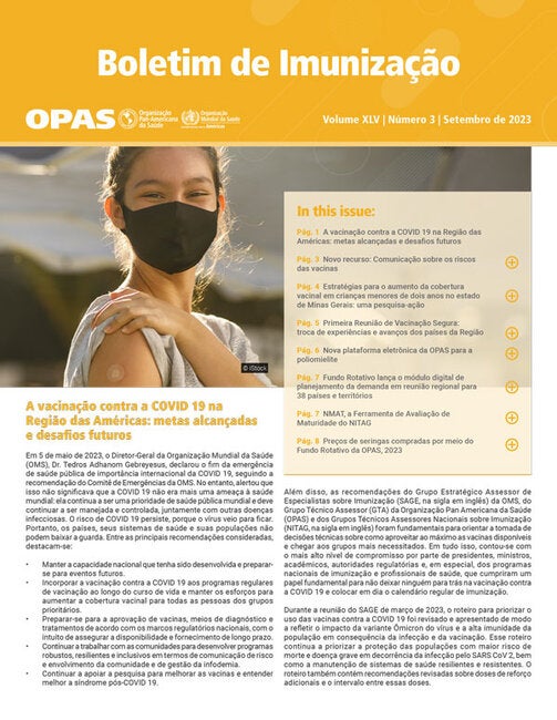 NESTA EDIÇÃO: A vacinação contra a COVID 19 na Região das Américas: metas alcançadas e desafios futuros | Novo recurso: Comunicação sobre os riscos das vacinas | Estratégias para o aumento da cobertura vacinal em crianças menores de dois anos no estado de Minas Gerais: uma pesquisa-ação | Primeira Reunião de Vacinação Segura: troca de experiências e avanços dos países da Região | Nova plataforma eletrônica da OPAS para a poliomielite | Fundo Rotativo lança o módulo digital de planejamento da demanda em reunião regional para 38 países e territórios | NMAT, a Ferramenta de Avaliação de Maturidade do NITAG | Preços de seringas compradas por meio do Fundo Rotativo da OPAS, 2023.