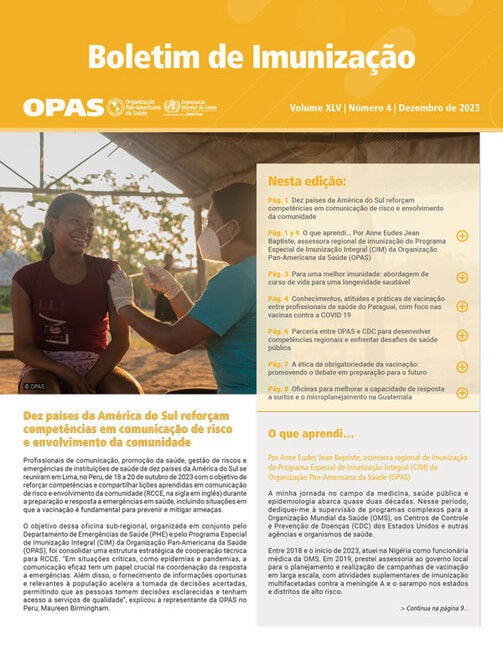 A Organização Pan-Americana da Saúde (OPAS) publica o Boletim de Imunização quatro vezes por ano em inglês, francês, português e espanhol. Seu objetivo é facilitar o intercâmbio de ideias e informações sobre programas de imunização na Região das Américas e fora dela. Ele é publicado desde 1979 em inglês e espanhol, com versões em francês e português iniciadas em 2001 e 2019, respectivamente. A edição de dezembro de 2023 do Boletim de Imunização aborda os seguintes tópicos: um workshop sobre o envolvimento da comunidade e a comunicação de riscos relacionados à vacinação, realizado em Lima, Peru, em outubro de 2023, com a participação de 10 países sul-americanos; O que aprendi... Por Anne Eudes Jean Baptiste, Assessora Regional de Imunização do Programa Especial de Imunização Integral (CIM) da Organização Pan-Americana da Saúde (OPAS); Construindo uma imunidade melhor: Uma abordagem do curso de vida para a longevidade saudável; Conhecimento, atitudes e práticas de vacinação entre os profissionais de saúde, com ênfase nas vacinas contra a COVID-19 no Paraguai; A OPAS e o CDC trabalham juntos para desenvolver capacidades regionais para enfrentar os desafios da saúde pública; A ética dos mandatos de vacinação: Avançando o debate para se preparar para o futuro; e Melhorando a capacidade de resposta a surtos e microplanejamento por meio de workshops na Guatemala. Esses artigos oferecem explorações e atualizações sobre vários aspectos dos programas de imunização na Região, mostrando o trabalho que está sendo feito com detalhes e fontes primárias de informação. O Boletim de Imunização é uma maneira confiável e regular de ver o amplo trabalho técnico que está sendo feito nesse campo pela OPAS, pelos ministérios da saúde e em colaboração com outras entidades e organizações internacionais.