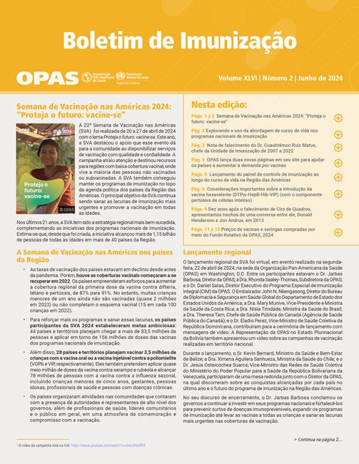 A Organização Pan-Americana da Saúde (OPAS) publica o Boletim de Imunização quatro vezes por ano em inglês, francês, português e espanhol. Seu objetivo é facilitar o intercâmbio de ideias e informações sobre programas de imunização na Região das Américas e fora dela. Ele é publicado desde 1979 em inglês e espanhol, com versões em francês e português iniciadas em 2001 e 2019, respectivamente. A edição de marzo de 2024 do Boletim de Imunização aborda os seguintes tópicos: Semana de Vacinação nas Américas 2024: “Proteja o futuro: vacine-se”; Nota de falecimento do Dr. Cuauhtémoc Ruiz Matus, chefe da Unidade de Imunização de 2007 a 2022 ; OPAS lança novas páginas em seu site para ajudar os países a aumentar a demanda por vacinas; Lançamento do painel de controle de imunização ao longo do curso de vida na Região das Américas; Considerações importantes sobre a introdução da vacina hexavalente (DTPw-HepB-Hib-VIP) (com o componente pertússis de células inteiras); Dez anos após o falecimento de Ciro de Quadros, apresentamos trechos de uma conversa entre ele, Donald Henderson e Jon Andrus, em 2013; Explorando o uso da abordagem de curso de vida nos programas nacionais de imunização; Preços de vacinas compradas por meio do Fundo Rotativo da OPAS, 2024 (preços em dólares dos Estados Unidos); Preços de seringas compradas por meio do Fundo Rotativo da OPAS, 2024 (preços em dólares dos Estados Unidos).