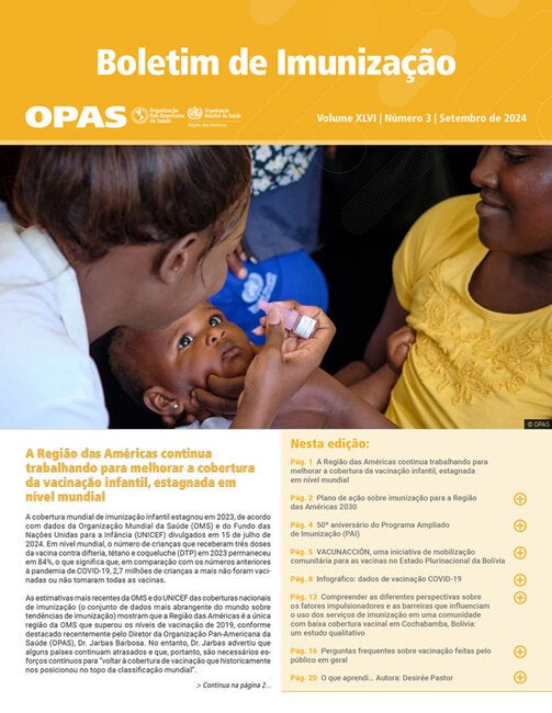 A Organização Pan-Americana da Saúde (OPAS) publica o Boletim de Imunização quatro vezes por ano em inglês, francês, português e espanhol. Seu objetivo é facilitar o intercâmbio de ideias e informações sobre programas de imunização na Região das Américas e fora dela. Ele é publicado desde 1979 em inglês e espanhol, com versões em francês e português iniciadas em 2001 e 2019, respectivamente. A edição de setembro de 2024 do Boletim de Imunização abrange o seguinte conteúdo: a divulgação de novos dados regionais de cobertura de vacinação; o plano regional de imunização para 2030; um infográfico sobre a vacinação contra a COVID-19 na Região; detalhes completos da Vacunacción, uma iniciativa de mobilização comunitária para vacinas no Estado Plurinacional da Bolívia; um estudo sobre a identificação de motivadores e barreiras na adoção da vacinação infantil em comunidades de dose zero em Cochabamba, no Estado Plurinacional da Bolívia; a comemoração do 50º aniversário da criação do Programa Ampliado de Imunização (PAI) em todo o mundo; perguntas frequentes para profissionais de saúde e o público em geral; e aprendizados como consultor do Programa Ampliado de Imunização (PAI), um consultor global de sarampo, rubéola e malária (MRV). aniversário da criação do Programa Ampliado de Imunização (EPI) em todo o mundo; perguntas frequentes para os profissionais de saúde e o público em geral; e as lições aprendidas como consultora sobre sarampo, rubéola e síndrome da rubéola congênita na OPAS por Desirée Pastor.