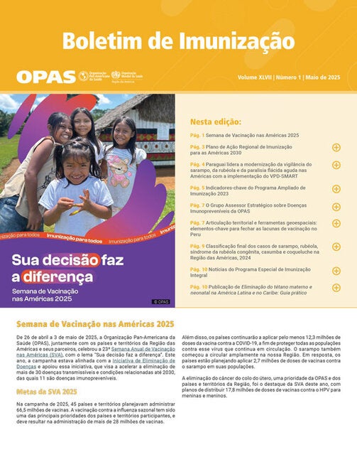 A Organização Pan-Americana da Saúde (OPAS) publica o Boletim de Imunização quatro vezes por ano em inglês, francês, português e espanhol. Seu objetivo é facilitar o intercâmbio de ideias e informações sobre programas de imunização na Região das Américas e fora dela. As versões em inglês e espanhol são publicadas desde 1979, enquanto as versões em francês e português são publicadas desde 2001 e 2019, respectivamente.A edição de maio de 2025 do Boletim de Imunização inclui um artigo que apresenta o Plano de Ação Regional de Imunização para as Américas 2030 (RIAP2030), que é resultado do trabalho conjunto com os países e territórios da Região das Américas e está alinhado com os documentos estratégicos Reinvigorating Immunization as a Public Good for Universal Health (Revitalizando a imunização como um bem público para a saúde universal) e Immunization Agenda 2030 (Agenda de Imunização 2030); um artigo sobre o Paraguai liderando a modernização da vigilância do sarampo, da rubéola e da paralisia flácida aguda nas Américas por meio da implementação do VPD-SMART; um infográfico sobre alguns indicadores do Formulário Conjunto de Relatórios sobre Imunização (JRF) da OPAS/OMS/UNICEF, uma ferramenta fundamental para fornecer uma visão ampla e abrangente do impacto, alcance e lacunas do Programa Ampliado de Imunização (PAI) nos países e territórios da Região das Américas; um resumo sobre o novo Grupo Consultivo Estratégico sobre Doenças Preveníveis por Vacinas da OPAS; Coordenação territorial e ferramentas geoespaciais: chaves para eliminar as lacunas na vacinação no Peru e dados para fornecer às equipes de saúde informações precisas e atualizadas para a concepção, implementação e monitoramento de ações-chave nos territórios; bem como um quadro visual com dados de casos de doenças preveníveis por vacinação para o ano de 2024.