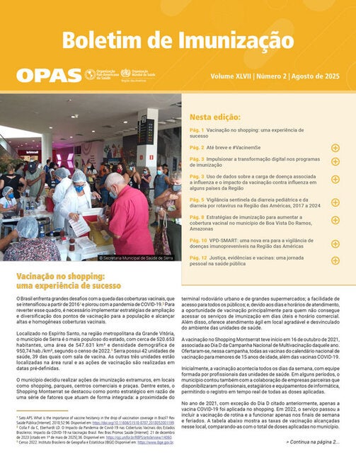 A Organização Pan-Americana da Saúde (OPAS) publica o Boletim de Imunização quatro vezes por ano em inglês, francês, português e espanhol. Seu objetivo é facilitar o intercâmbio de ideias e informações sobre programas de imunização na Região das Américas e fora dela. As versões em inglês e espanhol são publicadas desde 1979, enquanto as versões em francês e português são publicadas desde 2001 e 2019, respectivamente. A edição de agosto de 2025 do Boletim de Imunização inclui os seguintes artigos: Vacinação em shopping centers no Brasil: uma experiência bem-sucedida para alcançar uma cobertura vacinal alta e homogênea para a população; Impulsionando a transformação digital nos programas de imunização com um novo curso virtual sobre registros eletrônicos de imunização (EIRs) no Campus Virtual de Saúde Pública da OPAS; Uso de dados sobre a carga de saúde relacionada à gripe e o impacto da vacinação contra a gripe em países selecionados da Região, com informações sobre um workshop para a geração de evidências para apoiar políticas de saúde para a prevenção e controle da gripe sazonal; Vigilância sentinela da diarreia pediátrica e da diarreia por rotavírus na Região das Américas, de 2017 a 2024; Estratégias de imunização para aumentar a cobertura vacinal no município de Boa Vista Do Ramos, Amazonas, Brasil; VPD-SMART: uma nova era para a vigilância de doenças preveníveis por vacinas nas Américas; Justiça, evidências e vacinas: uma jornada pessoal na saúde pública, por Hugo Rázuri, Gerente Adjunto do Programa Especial de Imunização Integral (CIM) da OPAS; e despedida da editora associada do Boletim de Imunização nos últimos 12 anos, Octavia Silva.