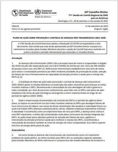 Introdução As doenças não transmissíveis (DNTs) são a principal causa de morte e incapacidade na Região das Américas pois são responsáveis por cerca de 6 milhões de mortes por ano. Cerca de 240 milhões de pessoas vivem com uma DNT. Referenciais internacionais estabeleceram uma série de metas para reduzir a mortalidade prematura por DNTs mediante atividades de promoção da saúde, redução de fatores de risco e fortalecimento da capacidade da atenção primária à saúde para o manejo das DNTs. A finalidade do Plano de ação sobre prevenção e controle de doenças não transmissíveis 2025–2030 é apoiar os Estados Membros na aceleração das ações necessárias para alcançar as metas mundiais relativas a DNTs. Reconhecendo a necessidade de uma abordagem de todo o governo e toda a sociedade, por meio de parcerias multissetoriais, para lidar com as DNTs, este plano de ação estabelece três linhas de ação estratégicas abrangentes a serem implementadas ao longo de seu período de vigência (2025–2030). Dado o amplo escopo da prevenção e do controle das DNTs e o período de vigência deste plano, os tópicos se concentram nos das metas mundiais relativas às DNTs que abrangem fatores de risco comuns (uso de tabaco, uso nocivo do álcool, alimentação não saudável e inatividade física) e as quatro principais DNTs (doenças cardiovasculares, câncer, diabetes e doenças respiratórias crônicas). A obesidade é reconhecida como um importante fator de risco para DNTs, a doença renal crônica é uma DNT importante, e ambas são contempladas neste plano como parte do manejo integrado das DNTs. As ações deste plano abordam políticas de redução dos fatores de risco, vigilância e intervenções da atenção primária à saúde para melhorar o manejo das DNTs, reconhecendo a necessidade de fortalecer também os níveis de atenção de maior complexidade. Esse último aspecto está fora do escopo deste plano de ação. Links relacionados |
