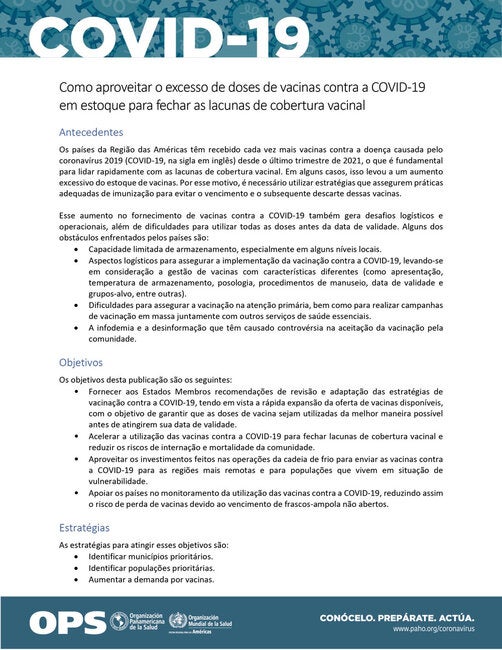 Desde o último trimestre de 2021, os países da Região das Américas têm recebido cada vez mais vacinas COVID-19, o que tem sido fundamental para resolver rapidamente as lacunas na cobertura vacinal. No entanto, esta situação levou, em alguns casos, a um aumento significativo dos estoques de vacinas. Esta publicação fornece aos países recomendações para revisão e adaptação das estratégias de vacinação COVID-19 para garantir que as doses sejam utilizadas de forma otimizada antes de atingir sua data de expiração. Ela também visa ajudar a fechar lacunas na cobertura vacinal, mitigar os riscos de hospitalização e mortalidade e alavancar investimentos na cadeia de frio para alcançar áreas remotas e populações vulneráveis.
