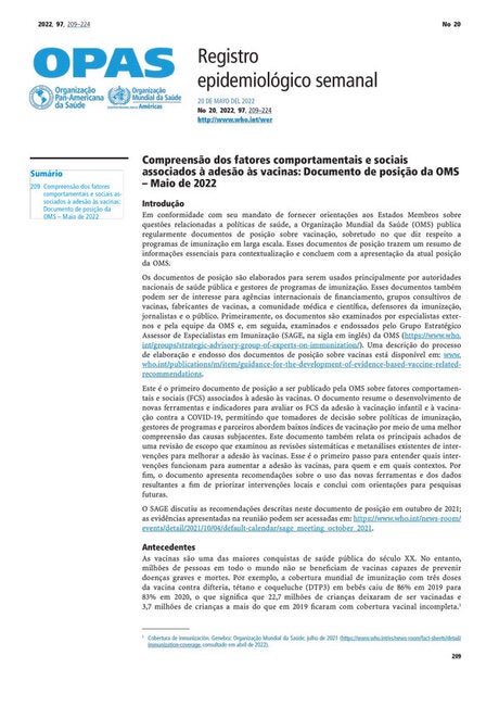De acordo com o mandato da OMS de fornecer orientação aos Estados Membros sobre questões de política de saúde, a organização emite regularmente documentos de posicionamento sobre vacinação, especialmente quando estão relacionados a programas de imunização em larga escala. Esses documentos de posicionamento resumem informações básicas essenciais e concluem apresentando a posição atual da OMS. Este é o primeiro documento de posicionamento a ser publicado pela OMS sobre os impulsionadores comportamentais e sociais (BeSD) da adoção de vacinas. Ele resume o desenvolvimento de novas ferramentas e indicadores para avaliar os fatores comportamentais e sociais da adesão à vacinação infantil e à COVID-19, permitindo que os tomadores de decisão sobre a política de imunização, os gerentes de programas e os parceiros abordem a subvacinação por meio de uma melhor compreensão das causas subjacentes. Este documento também relata os principais resultados de uma revisão de escopo que examinou as revisões sistemáticas e meta-análises existentes sobre intervenções para melhorar a adesão à vacinação - um primeiro passo para entender quais intervenções funcionam para aumentar a adesão à vacinação, para quem e em quais contextos. Por fim, este documento faz recomendações para o uso das novas ferramentas e dos dados resultantes para priorizar as intervenções locais e conclui com orientações para pesquisas futuras. Link para o documento original da WHOhttps://iris.who.int/handle/10665/354458 |