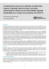 O presente documento salienta um quadro de tomada de decisões para a implementação de intervenções de tratamento em massa, campanhas de procura activa de casos e inquéritos às populações sobre as DTN no contexto da pandemia de COVID-19. Formula considerações destinadas a fornecer orientações às autoridades sanitárias relevantes, aos directores de programas de DTN e seus parceiros de apoio sobre...