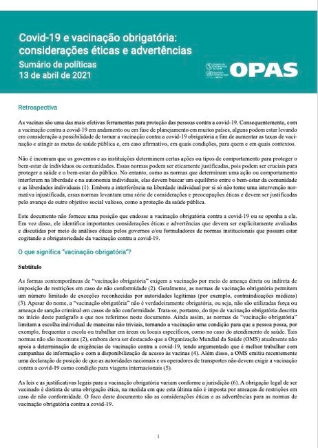Este documento não fornece uma posição que endosse a vacinação obrigatória contra a covid-19 ou se oponha a ela. Em vez disso, ele identifica importantes considerações éticas e advertências que devem ser explicitamente avaliadas e discutidas por meio de análises éticas pelos governos e/ou formuladores de normas institucionais que possam estar cogitando a obrigatoriedade da vacinação contra a covid-19.