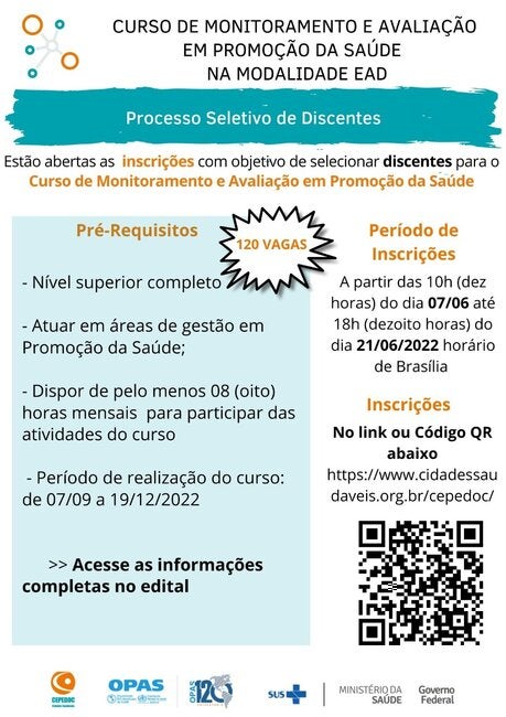 O Centro de Estudos, Pesquisa e Documentação em Cidades Saudáveis (CEPEDOC – Cidades Saudáveis) em parceria institucional com a Organização Pan-Americana da Saúde/Organização Mundial da Saúde e o Ministério da Saúde (MS), tornam pública a abertura das inscrições para o processo de seleção para preenchimento das vagas de discentes do Curso de Monitoramento e Avaliação em Promoção da Saúde, na modalidade EAD, conforme disposto no Edital nº 2 de 07 de junho de 2022.