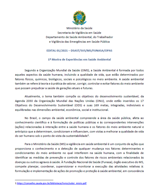 Em celebração ao Dia Mundial da Saúde Ambiental, que se comemora em 26 de setembro, a Organização Pan-Americana da Saúde/Organização Mundial da Saúde (OPAS/OMS) no Brasil, o Departamento de Saúde Ambiental (DESAM) da Funasa e o Ministério da Saúde, por meio da Coordenação Geral de Vigilância em Saúde Ambiental do Departamento de Saúde Ambiental, do Trabalhador e Vigilância das Emergências em Saúde Pública da Secretaria de Vigilância em Saúde (CGVAM/DSASTE/SVS/MS), lançam a 1ª Mostra de Experiências em Saúde Ambiental, com o objetivo de identificar, dar visibilidade, reconhecer e promover iniciativas locais, municipais ou regionais, em serviços, que tenham como foco principal o tema da Saúde Ambiental. A Mostra se apresenta como uma estratégia para estimular o debate e compartilhar conhecimento, de forma célere, de práticas na área de saúde ambiental.