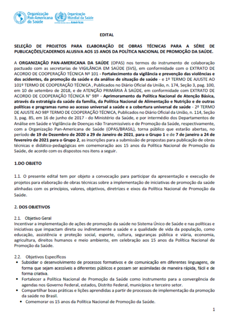 Com o objetivo de incentivar a implementação de ações de promoção da saúde no Sistema Único de Saúde (SUS) brasileiro, a Organização Pan-Americana da Saúde (OPAS) em cooperação com o Ministério da Saúde do Brasil lançam, neste sábado (19) edital para selecionar obras técnicas e didático-pedagógicas para a promoção da saúde. Cada projeto selecionado receberá R$ 60 mil mediante assinatura de Carta Acordo com a OPAS para execução do projeto.