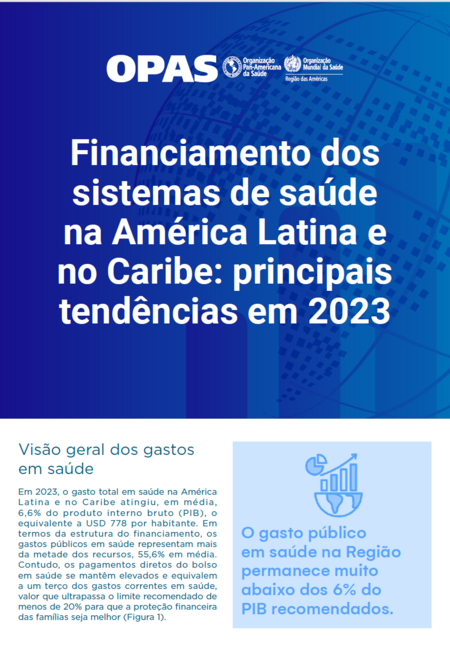O gasto público em saúde na América Latina e no Caribe representa mais da metade dos recursos, com uma média de 55,6%. Por outro lado, o gasto direto do bolso em saúde permanece em níveis elevados e equivale a um terço do gasto corrente em saúde, superando o limiar recomendado de menos de 20% para alcançar uma maior proteção financeira dos domicílios. Este documento apresenta as tendências do gasto em saúde na Região em 2023 e mostra que o objetivo estratégico de alcançar níveis de gasto equivalentes a 6% do produto interno bruto continua distante para a maioria dos países da sub-região. Essa situação prejudica os avanços rumo a um gasto em saúde mais sustentável e previsível, bem como a possibilidade de uma melhor proteção financeira dos domicílios. As tendências do gasto em saúde mostram que, após a emergência da COVID-19, em 2020 e 2021, os níveis de investimento em saúde retornaram aos de 2019, comprometendo os avanços informados. |