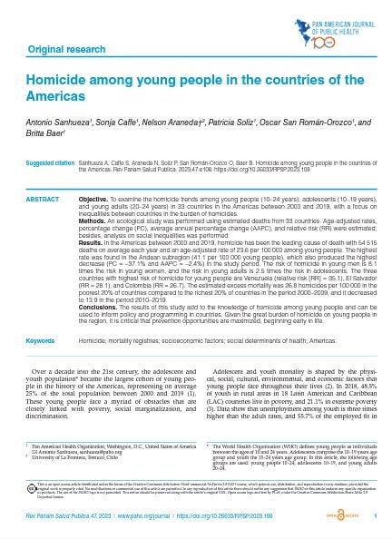 Objetivo. Examinar as tendências de homicídios entre pessoas jovens (10 a 24 anos), adolescentes (10 a 19 anos) e adultas jovens (20 a 24 anos) em 33 países das Américas entre 2000 e 2019, com foco em desigual- dades da carga de homicídios entre países. Métodos. Foi realizado um estudo ecológico usando estimativas de óbitos de 33 países. Foram estimadas taxas ajustadas por idade, variação percentual (VP), variação percentual anual média (VPAM) e risco relativo (RR); além disso, foi realizada uma análise das desigualdades sociais. Resultados. Entre 2000 e 2019, o homicídio foi a principal causa de morte nas Américas, com uma média de 54.515 óbitos por ano e uma taxa ajustada por idade de 23,6 por 100 mil pessoas entre pessoas jovens. A taxa mais alta foi encontrada na sub-região andina (41,1 por 100 mil jovens), que também registrou a redução mais acentuada (VP = -37,1% e VPAM = -2,4%) no período do estudo. O risco de homicídio entre homens jovens é 8,1 vezes maior que o risco em mulheres jovens, e o risco entre pessoas adultas jovens é 2,5 vezes maior que o risco em adolescentes. Os três países com maior risco de homicídio entre pessoas jovens são Venezuela (RR = 35,1), El Salvador (RR = 28,1) e Colômbia (RR = 26,7). Nos países, o excesso de mortalidade estimado foi de 26,8 homicídios por 100 mil habitantes nos 20% mais pobres comparados aos 20% mais ricos no período de 2000 a 2009. Esse número diminuiu para 13,9 no período de 2010 a 2019. Conclusões. Os resultados deste estudo se somam às informações sobre homicídios entre jovens e podem ser usados para embasar políticas e programas nacionais. Dado o grande ônus que os homicídios represen- tam para as pessoas jovens da região, é fundamental que as oportunidades de prevenção sejam maximizadas desde cedo em suas vidas.