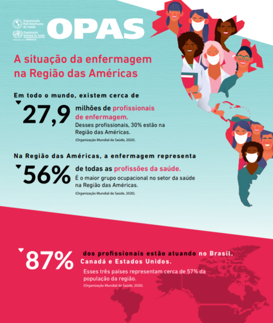 O infográfico apresenta de forma sucinta a situação da enfermagem. Os dados são apresentados sobre a situação numérica de todos os países da Região das Américas, dados sobre a percentagem do sexo masculino e feminino e dados sobre a percentagem dos enfermeiros em relação à força de trabalho em saúde. Os dados foram extraídos do relatório da OMS intitulado O Estado da Enfermagem no Mundo, publicado em 2020. Este infográfico será usado para apresentar dados a países, governos, ministérios da saúde, universidades, profissionais, estudantes e outras partes interessadas.