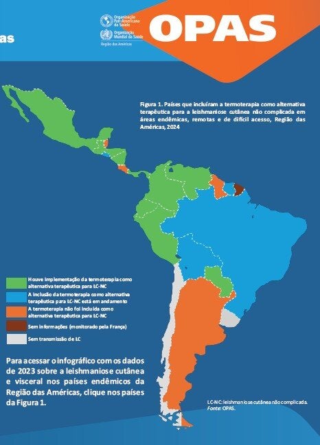 Este relatório apresenta a tendência da leishmaniose e uma análise detalhada dos dados correspondentes a 2023 das diferentes formas clínicas desta doença na Região das Américas. Além disso, uma série de infográficos são incluídos com dados específicos sobre leishmaniose cutânea (LC), mucosa (LM) e visceral (LV) em países endêmicos. Ao longo dos anos, houve uma tendência de diminuição dos casos de leishmaniose; no entanto, quando os dados são analisados separadamente por país, verifica-se uma tendência de aumento dos casos de LV na Argentina e no Paraguai, e para LC na Argentina, Costa Rica, Equador, México e Suriname. |