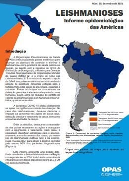 Este informe apresenta uma análise detalhada dos dados das leishmanioses na Região das Américas para 2020 e inclui uma série de infográficos com dados específicos para leishmaniose cutânea e mucosa nos países endêmicos. Como resultado da pandemia COVID-19, as atividades de busca ativa, de diagnóstico precoce e o tratamento dos casos, bem como outras atividades de campo, foram reduzidas. Entre os desafios enfrentados pela Região, destaca-se a necessidade de os países retomarem as atividades e avançarem com o diagnóstico e tratamento de casos das diferentes formas clínicas da doença. Além disso, é necessário identificar estratégias para o seguimento e monitoramento dos casos, a fim de atingir a meta de tratar pelo menos 90% dos pacientes diagnosticados.