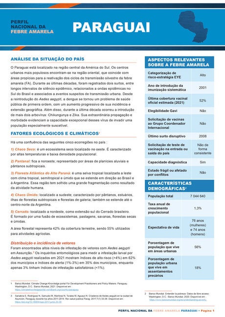 A febre amarela é uma doença endêmica em vários países da América Latina. Para ajudar os tomadores de decisão a priorizar ações preventivas contra esta doença, a Organização Pan-Americana de Saúde apresenta estes perfis de países com uma seleção concisa e abrangente de dados de países endêmicos. Cada perfil fornece uma análise da situação atual do país, fatores ecológicos e climáticos associados à doença, distribuição e incidência vetorial e atividade arboviral chave. Também inclui uma perspectiva histórica da epidemiologia e um resumo da situação da vacinação contra a doença no país.