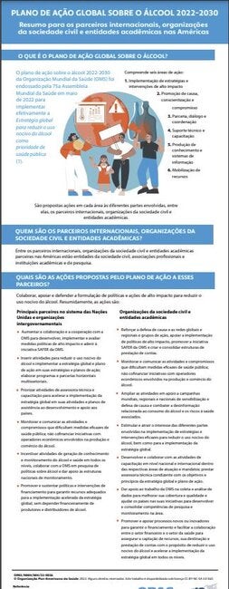 O plano de ação global sobre o álcool 2022-2030 da Organização Mundial da Saúde foi endossado pela 75ª Assembleia Mundial da Saúde em maio de 2022 para implementar efetivamente a Estratégia global para reduzir o uso nocivo de álcool como uma prioridade de saúde pública. Para cada área, são propostas ações para diferentes tipos de stakeholders. Esta ficha técnica apresenta um resumo das medidas propostas para os parceiros internacionais, organizações da sociedade civil e entidades acadêmicas nas Américas.