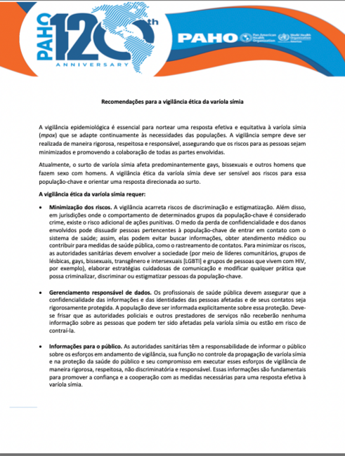 A vigilância é uma atividade essencial de saúde pública, mas enfrenta desafios éticos. O surto de varíola símia (mpox) afeta predominantemente gays, bissexuais e outros homens que fazem sexo com homens. A vigilância da varíola símia, especificamente, enfrenta os riscos de discriminação e estigmatização, além de ações punitivas em jurisdições onde o comportamento de qualquer grupo da população-chave é considerado crime. Conscientização sobre esses riscos e orientação específica para enfrentar outros desafios éticos da vigilância da varíola símia são necessários para promover sua vigilância ética. Esta breve orientação fornece recomendações destinadas a garantir que a vigilância da varíola símia seja conduzida de forma ética. As recomendações foram elaboradas com base nas diretrizes da OMS sobre questões éticas na vigilância em saúde pública.