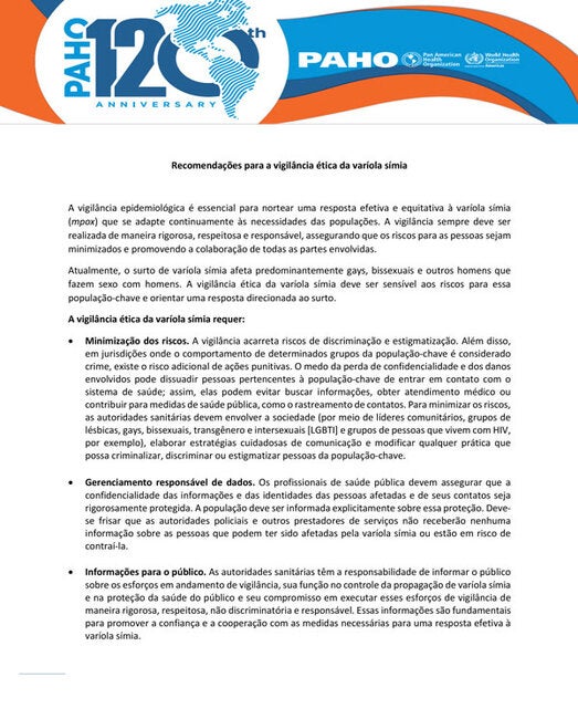 A vigilância é uma atividade essencial de saúde pública, mas enfrenta desafios éticos. O surto de varíola símia (mpox) afeta predominantemente gays, bissexuais e outros homens que fazem sexo com homens. A vigilância da varíola símia, especificamente, enfrenta os riscos de discriminação e estigmatização, além de ações punitivas em jurisdições onde o comportamento de qualquer grupo da população-chave é considerado crime. Conscientização sobre esses riscos e orientação específica para enfrentar outros desafios éticos da vigilância da varíola símia são necessários para promover sua vigilância ética. Esta breve orientação fornece recomendações destinadas a garantir que a vigilância da varíola símia seja conduzida de forma ética. As recomendações foram elaboradas com base nas diretrizes da OMS sobre questões éticas na vigilância em saúde pública.