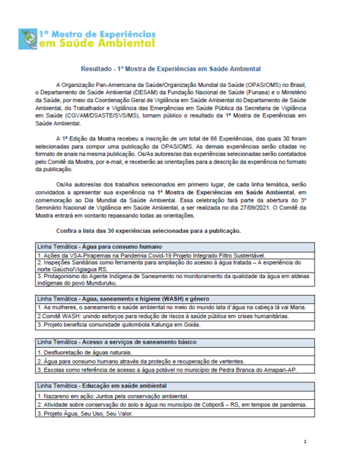 A Organização Pan-Americana da Saúde/Organização Mundial da Saúde (OPAS/OMS) no Brasil, o Departamento de Saúde Ambiental (DESAM) da Fundação Nacional de Saúde (Funasa) e o Ministério da Saúde, por meio da Coordenação Geral de Vigilância em Saúde Ambiental do Departamento de Saúde Ambiental, do Trabalhador e Vigilância das Emergências em Saúde Pública da Secretaria de Vigilância em Saúde (CGVAM/DSASTE/SVS/MS), tornam público o resultado da 1ª Mostra de Experiências em Saúde Ambiental.