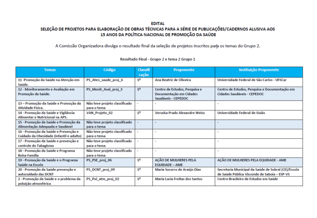 O Comitê Organizador parabeniza os selecionados do Grupo 2 e para o tema 2 do Grupo 1 e informa que em breve coordenadores dos projetos e instituições proponentes serão contatados para os procedimentos de assinatura das Cartas Acordo, conforme previsto no Edital.