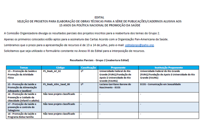 O Comitê Organizador informa o resultado parcial referente aos projetos inscritos a partir da reabertura do Edital dos 15 anos da PNPS para os temas do Grupo 2. O prazo para a apresentação de recursos é das 8h do dia 13 de julho às 23h59 do dia 14 de julho, pelo e-mail: editalpnps@paho.org. O Comitê Organizador solicita que seja utilizado o formulário constante no Anexo III do Edital para a interposição de recursos. |
