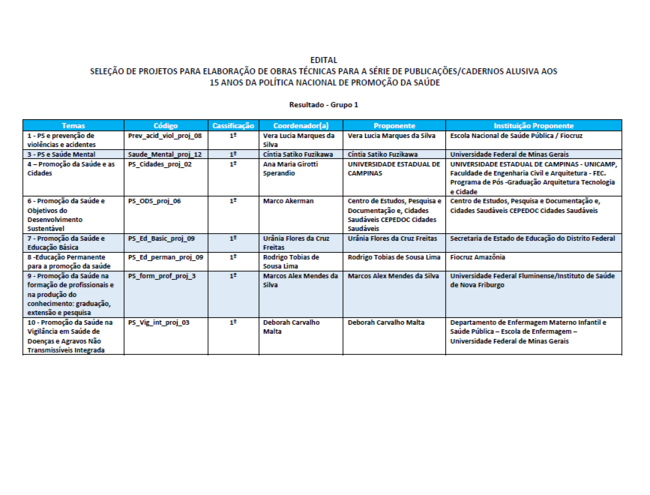 O Comitê Organizador parabeniza os selecionados do Grupo 1 e informa que em breve coordenadores dos projetos e instituições proponentes serão contatados para os procedimentos de assinatura das Cartas Acordo, conforme previsto no Edital.