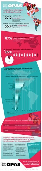 O infográfico apresenta de forma sucinta a situação da enfermagem. Os dados são apresentados sobre a situação numérica de todos os países da Região das Américas, dados sobre a percentagem do sexo masculino e feminino e dados sobre a percentagem dos enfermeiros em relação à força de trabalho em saúde. Os dados foram extraídos do relatório da OMS intitulado O Estado da Enfermagem no Mundo, publicado em 2020. Este infográfico será usado para apresentar dados a países, governos, ministérios da saúde, universidades, profissionais, estudantes e outras partes interessadas.