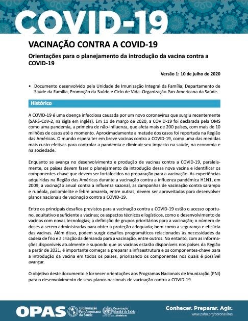 O objetivo deste documento é fornecer orientações aos Programas Nacionais de Imunização (PNI) para o desenvolvimento de seus planos nacionais de vacinação contra a COVID-19. No desenvolvimento desses planos nacionais, é importante envolver o Grupo Técnico Assessor Nacional sobre Imunização. Também é importante levar em consideração as recomendações prévias emitidas pela OPAS/OMS sobre as medidas de segurança dos profissionais de saúde e da população contra a COVID-19.