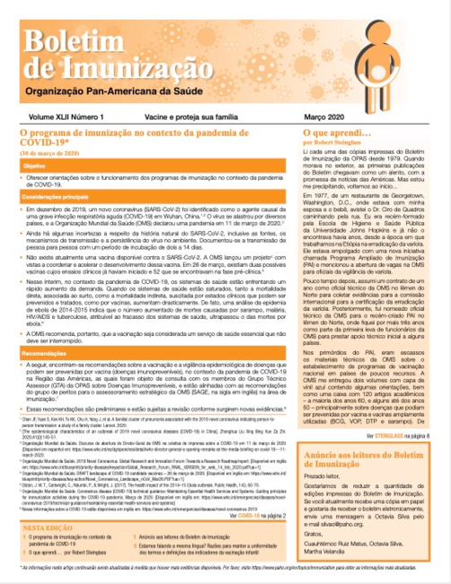 Nesta edição: O programa de imunização no contexto da pandemia de COVID-19 | Vacinação de rotina durante a pandemia de COVID-19 | Vacinação de pessoas com diagnóstico de COVID-19 e seus contatos | Realização de campanhas de vacinação | Orientação para os postos de vacinação | Restabelecimento dos serviços de vacinação | Cadeia de frio e abastecimento de vacinas e provisões | Vigilância epidemiológica das doenças imunopreveníveis | Estamos falando a mesma língua? Razões para manter a uniformidade dos termos e definições dos indicadores da vacinação infantil.