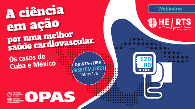 A Organização Pan-Americana da Saúde convida você a participar do webinar "A ciência em ação por uma melhor saúde cardiovascular. Os casos de Cuba e Méxicos", que será apresentado pela Iniciativa HEARTS nas Américas na quinta-feira, 9 de setembro de 2021, das 15h00 às 16h00 (horario de Brasília)