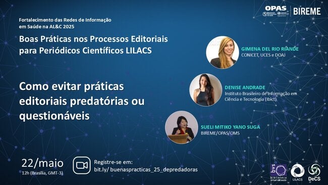 Na quinta-feira, 22 de maio de 2025, às 12h00 (Brasília, GMT-3), a BIREME realizará o webinário “Como evitar práticas editoriais predatórias ou questionáveis”, que marcará a segunda sessão de “Boas práticas nos processos editoriais para periódicos científicos LILACS”. Essa iniciativa faz parte do programa de cooperação técnica para o fortalecimento das Redes de Informação em Saúde na América Latina e Caribe.