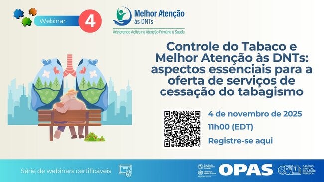 Junte-se a nós na terça-feira, 4 de novembro de 2025, às 11h (horário de verão do leste dos EUA) para o webinar Controle do Tabaco e Melhor Atenção às DNTs: aspectos essenciais para a oferta de serviços de cessação do tabagismo, o quarto webinar de uma série de cinco webinars certificáveis da Iniciativa de Melhor Atenção às DNTs.