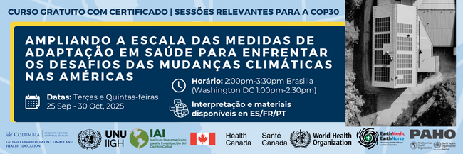 Este curso virtual e gratuito é organizado pela Organização Pan-Americana da Saúde (OPAS), pelo Consórcio Global sobre Educação em Clima e Saúde da Universidade de Columbia, pela Organização Mundial da Saúde (OMS), o Instituto Interamericano para Pesquisa sobre Mudanças Globais (IAI), a Fundação EarthMedic e EarthNurse para a Saúde Planetária, o Instituto Internacional para a Saúde Global, a Universidade das Nações Unidas e Saúde Canadá.